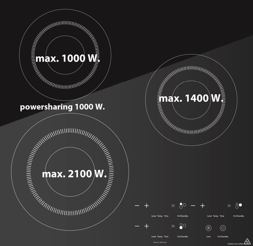 - Timer, Leistungsstufen und Temperatur bei jedem Kochfeld individuell einstellbar