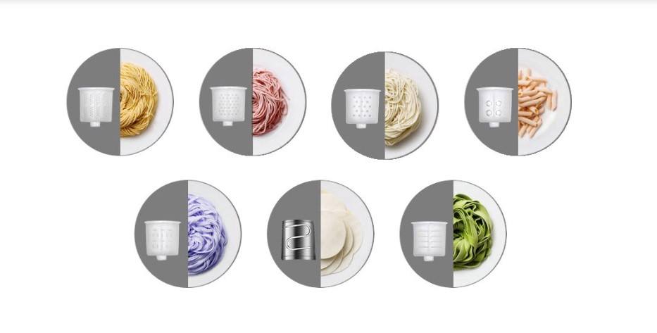 - 7 auswechselbare Nudelform-Einsätze, Aufbewahrung in integrierter Zubehörbox